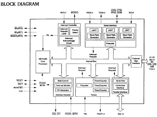 Features: (1)68HC000 core based microprocessor; (2)3 asnchronous serial ports with baud rate generators with optional modem control; (3)16 bit parallerl interface with optional centronics interface port; (4)3 timer channels, 16 bits each with an 8 bit prescaler; (5)built-in intertupt controller, 3 external and 7 internal chnnels with auto interrupt vector generation; (6)sophisticated address decoder, includes relocatable chip select generate for internal registers and externals chip selects; (7)automatic DTACK generation with 0 to 7 wait states and programmable berr generation.